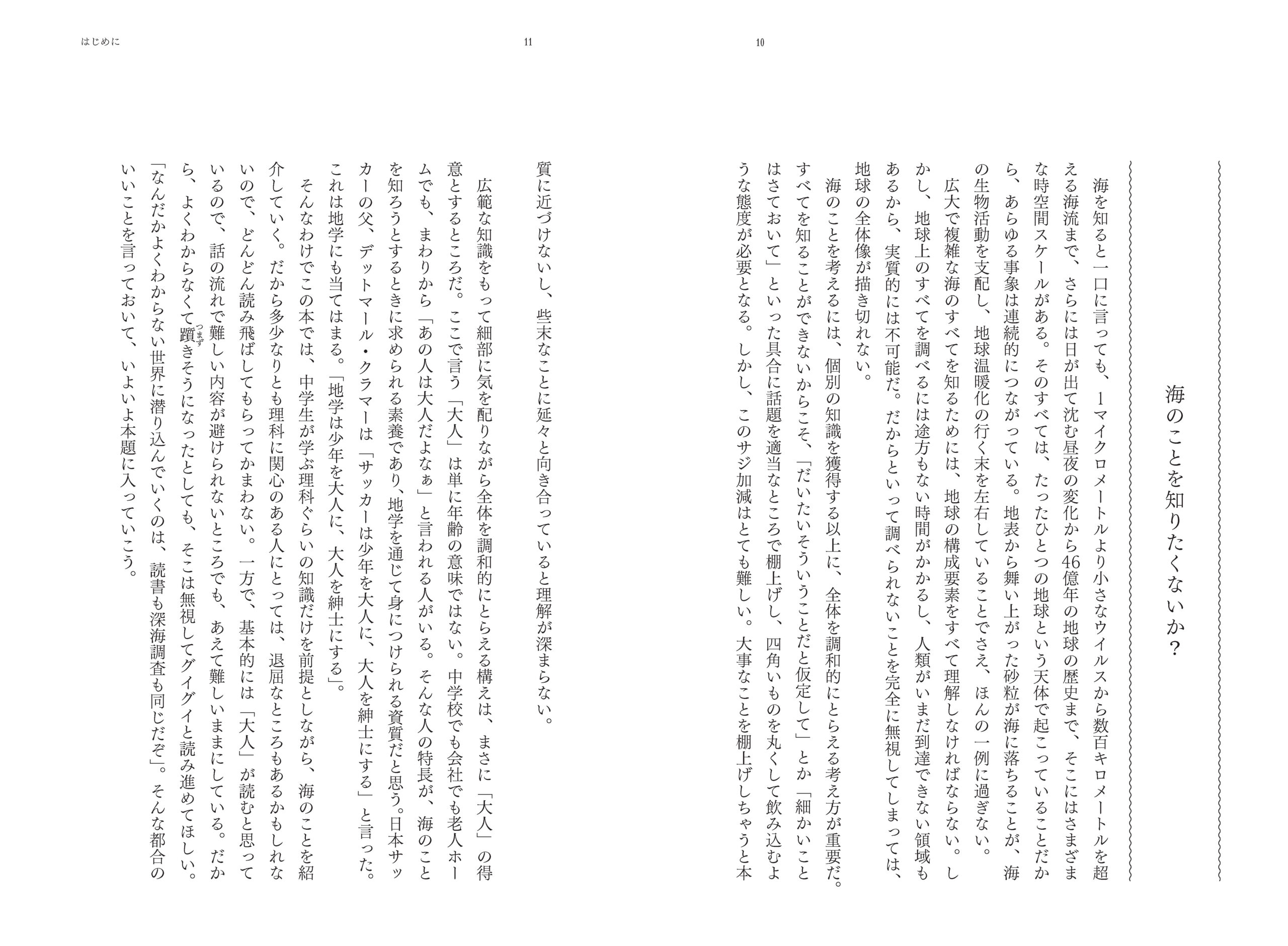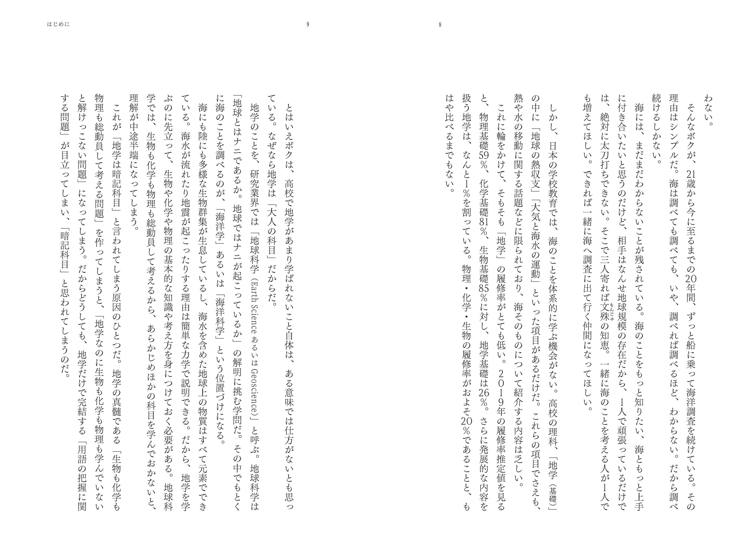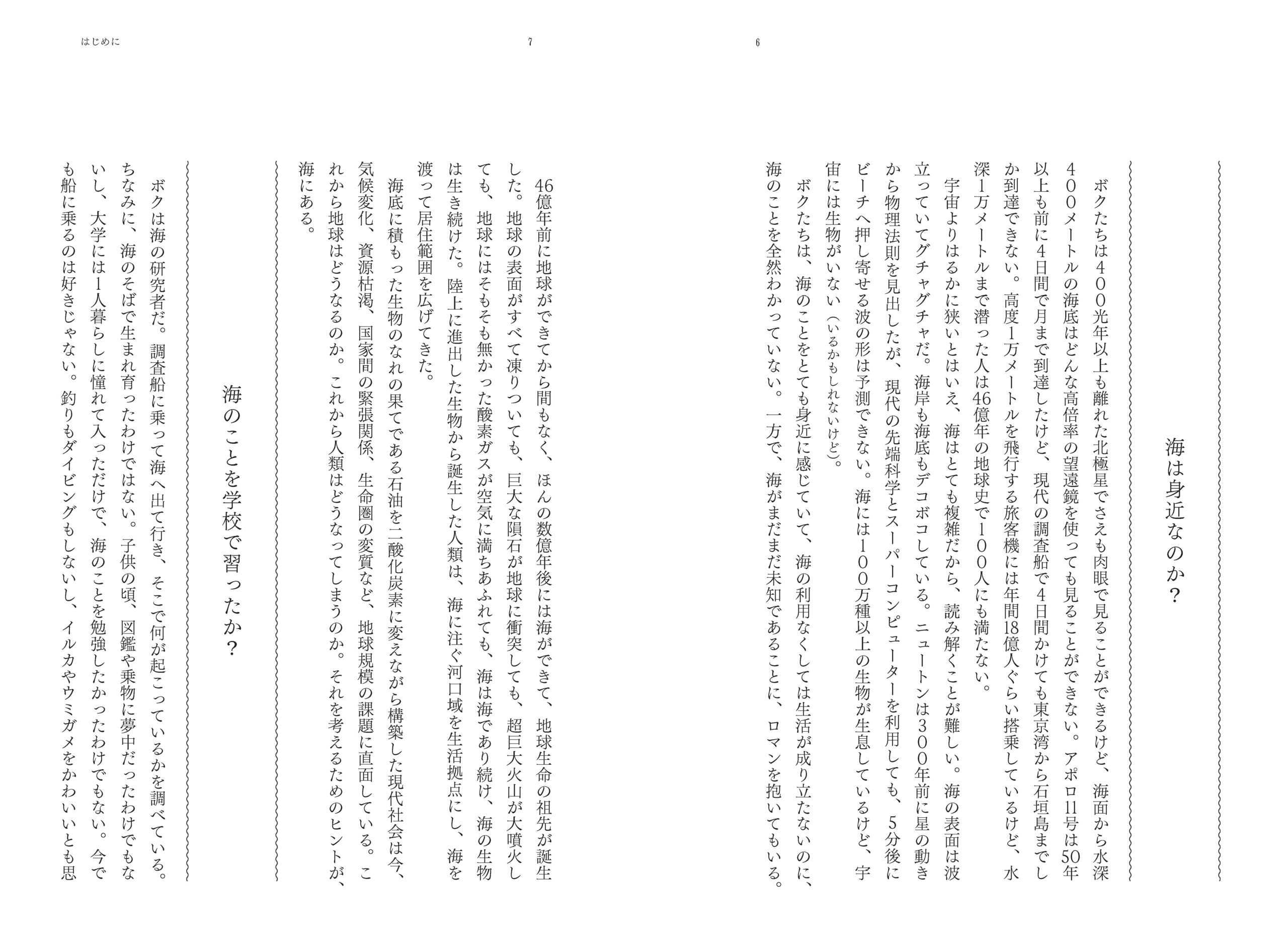 本書は海の研究者である著者が、海とは何か? 地球とは何か? を問答しながら、生命の起源、深海の謎、地球深部の探査、海底資源の開発、気候変動の対策といった地球規模のテーマについて探究していきます。