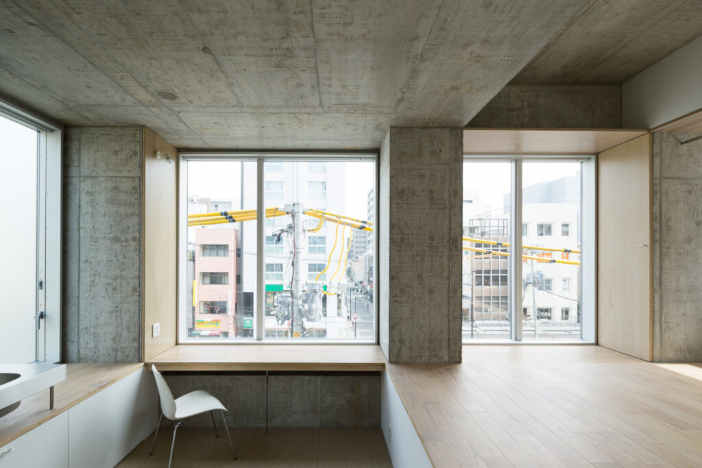 「辰巳アパートメントハウス」は地上10階のRCラーメン構造。1室当たり30㎡強ほどの広さしかないなか、下階では柱の奥行きが人の肩幅の倍ほど、梁の段差は腰高ほどもあり、存在感はかなり大きい。一方、凹凸の奥行きや高さを、身体的な寸法に応じて微調整すれば、さまざまな居場所を提供できる。ここでは、キッチンカウンターやベンチ、ベッドスペース、デスクなどとして価値を付与した[写真=西川公朗]