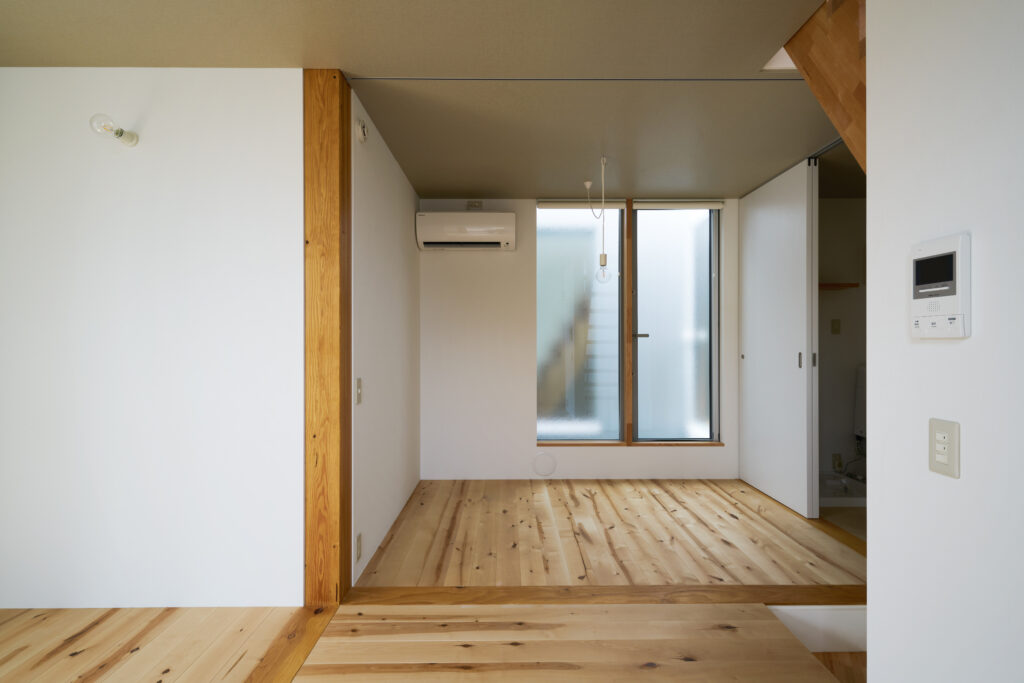「ニシオギソウ」の一室。2,730㎜ピッチで配される150㎜角の柱と敷居をあらわしにし、またフローリングの向きを変えることでグリッドを視覚化している。採用したペンダントライトはコードをたっぷり残して、住まい手が位置や高さを調節できる余地を確保した[写真=阿野太一]