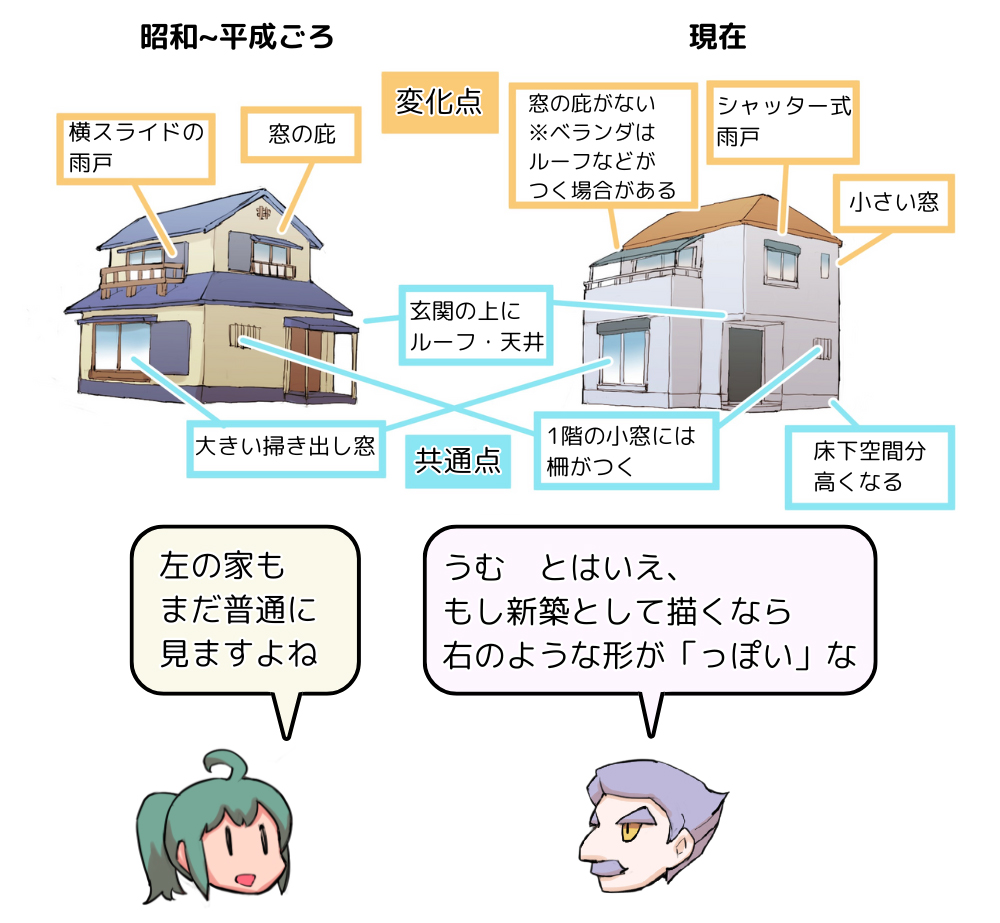 「西洋っぽい」家を描いているつもりで、なんとなく当たり前に描いた形が実は「西洋にはあまり見られない日本的な形」だった、ということがあるかもしれません。