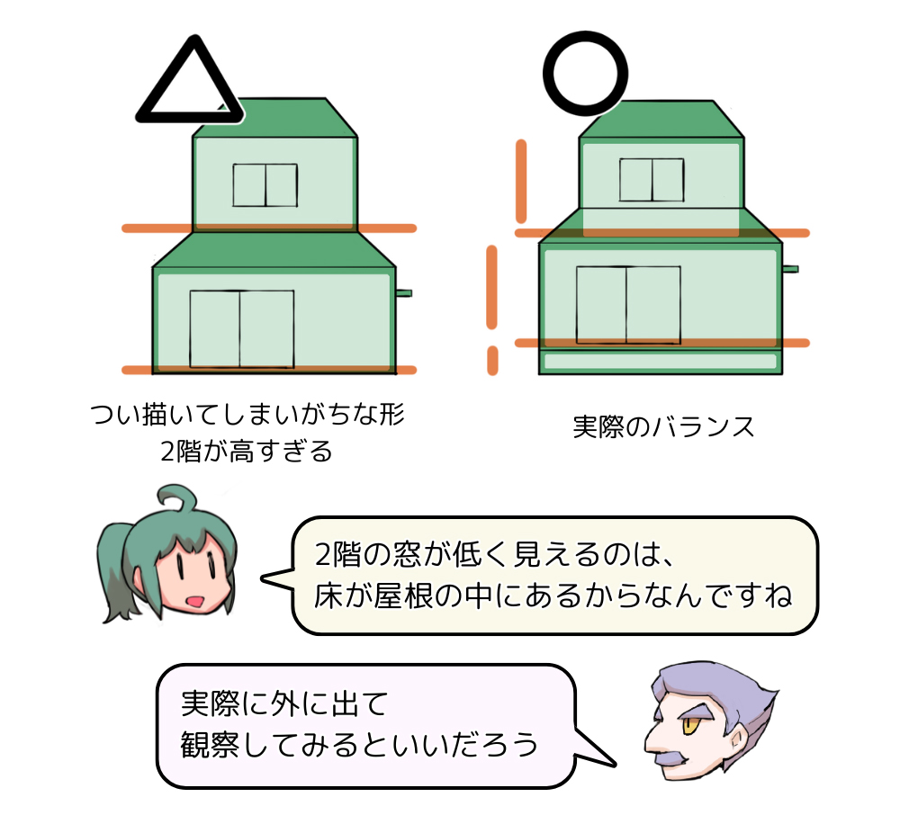 日本の家を描く時、2階の「外壁の高さ」を1階に合わせて、左の図のようなフォルムで描いてしまうことがあります。