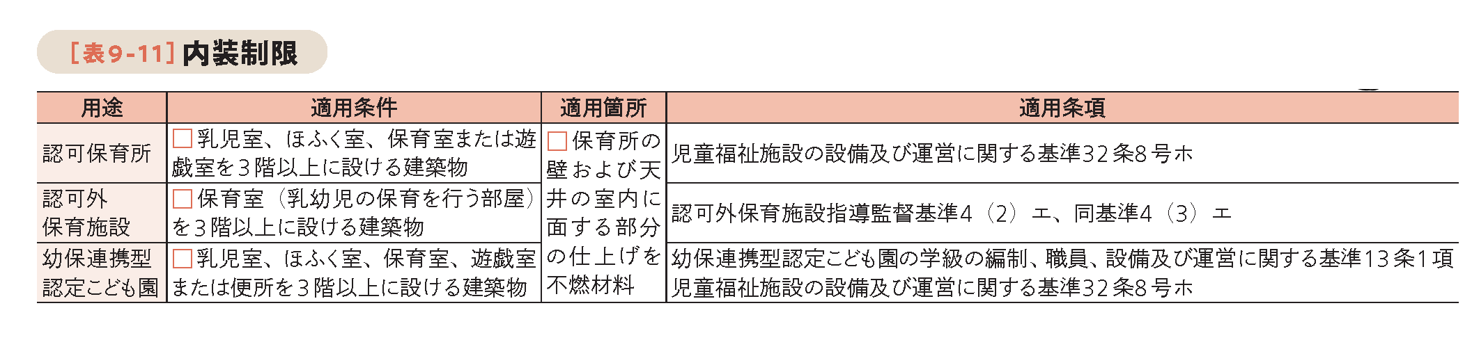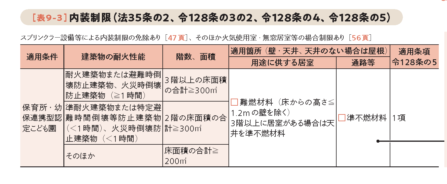 幼保連携型認定こども園は、排煙設備(令126条の2)・非常用照明(令126条の4)・内装制限(令128条の5)[下表]の規制が、保育所と同様の基準で適用されます。