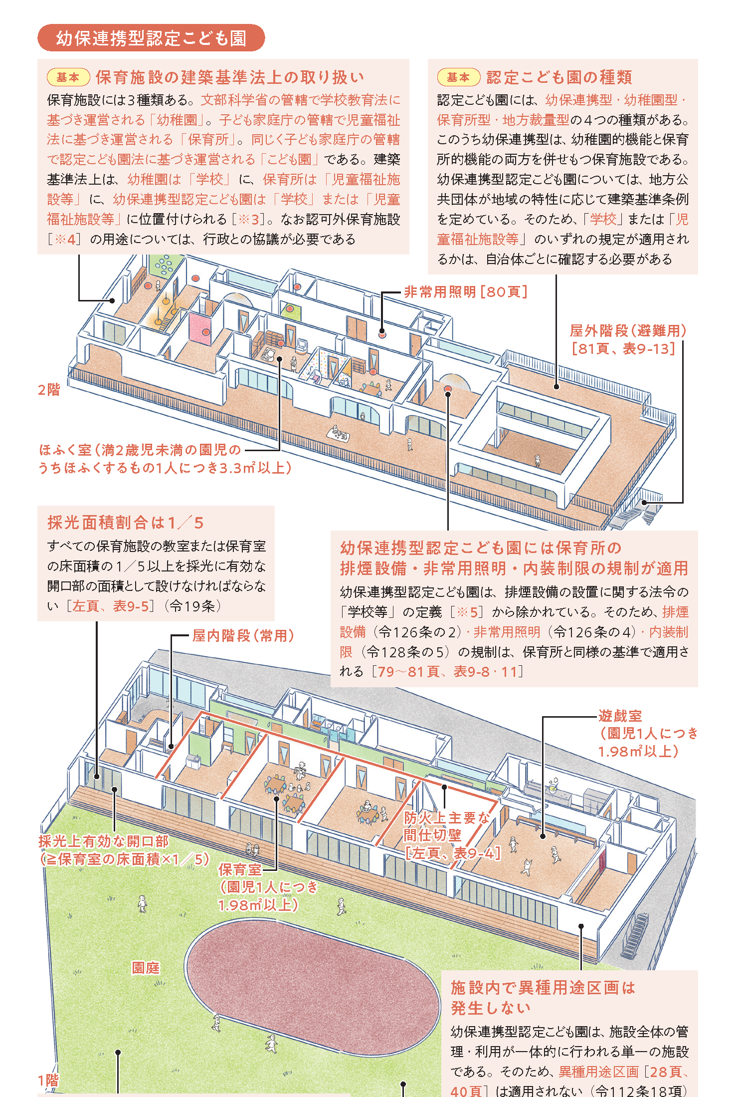 建築基準法上は、幼稚園は「学校」に、保育所は「児童福祉施設等」*に、幼保連携型認定こども園は「学校」または「児童福祉施設等」に位置付けられるワン!「学校」と「児童福祉施設等」とで適用される規定が異なる場合、より厳しい規定が適用されるワン