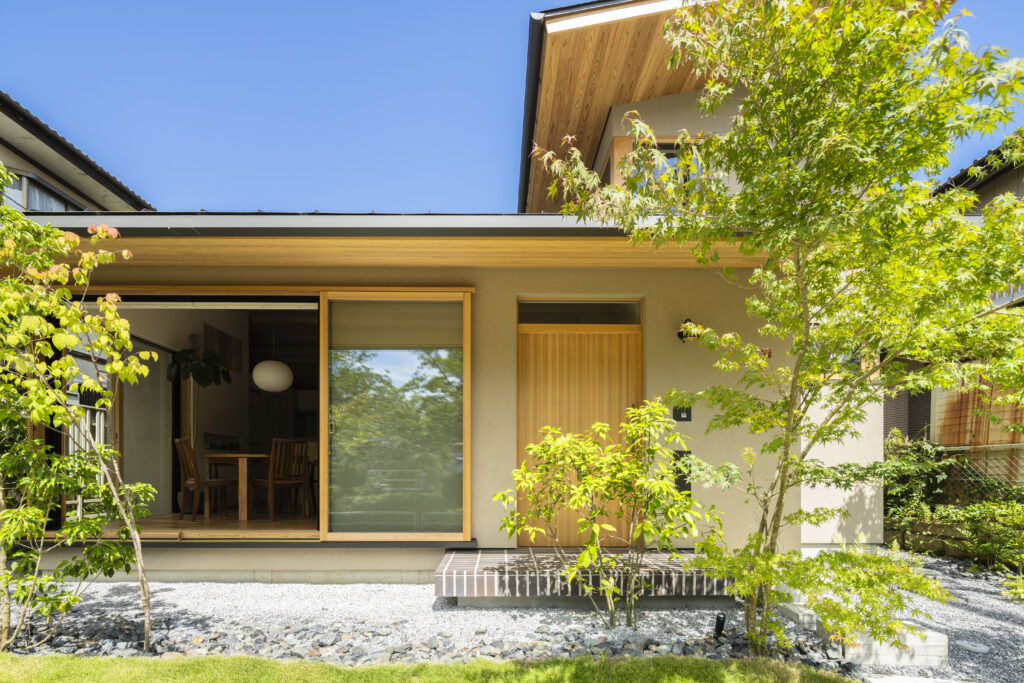 一方、敷地奥にはプライベートな中庭を配置。1階は中庭を囲うL字の平面形です。深い軒をかけることで、隣地からの視線を遮り、庭とつながる半屋外の縁側空間をつくりました。