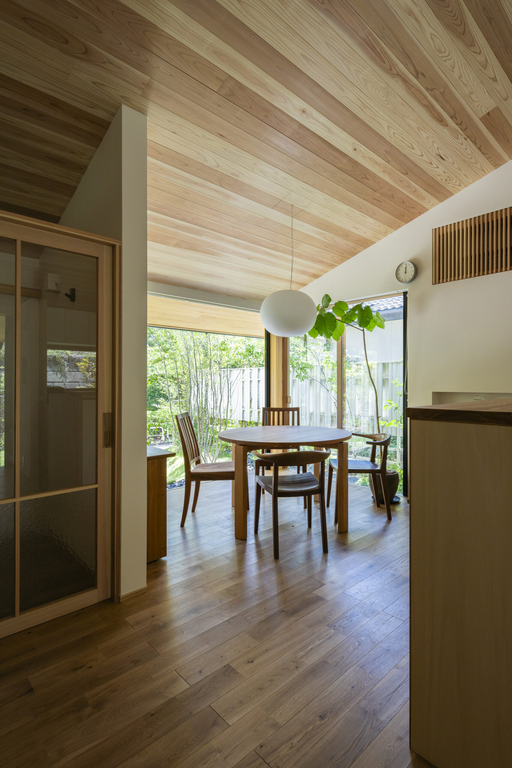 前庭に面するダイニング。奥の緑地公園へと視線が抜ける。眺望のための開口部は意匠性の高い造作の木建とした。造作の木建は、既製品に比べて気密・断熱性能が劣るが、ピンチブロックと木部の嵌合により気密性を高め、かつ、内部側にハニカムサーモスクリーンを組み込むことで温熱環境を担保している