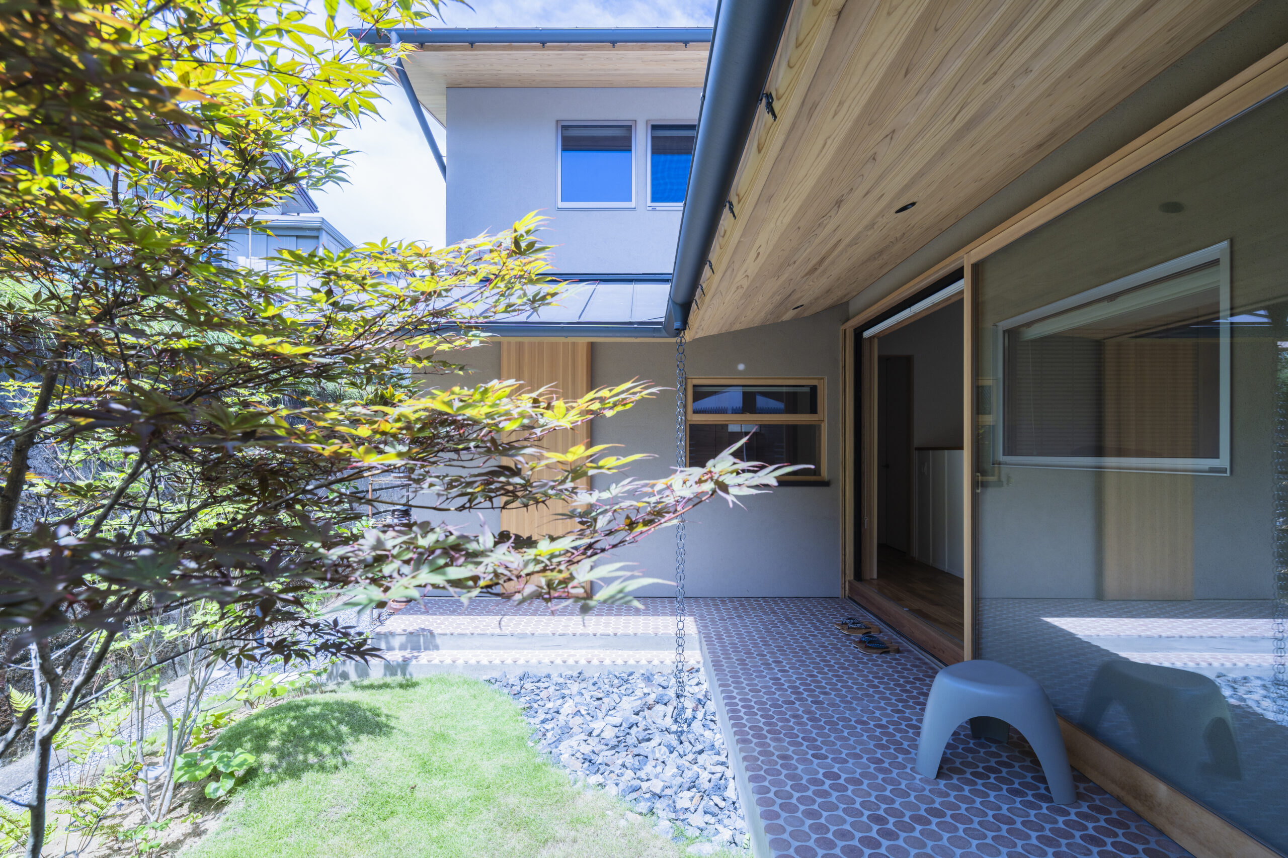 一方、敷地奥にはプライベートな中庭を配置。1階は中庭を囲うL字の平面形です。深い軒をかけることで、隣地からの視線を遮り、庭とつながる半屋外の縁側空間をつくりました。