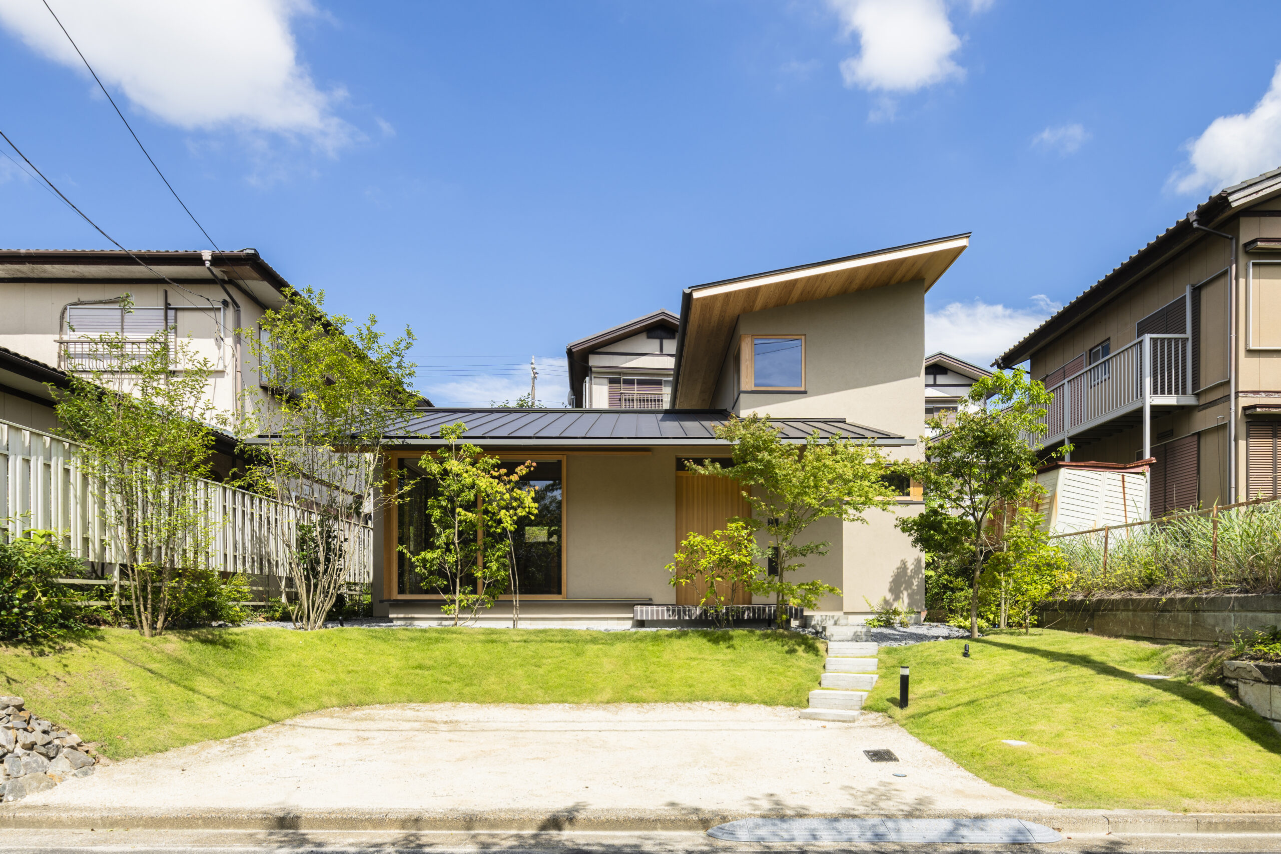 ファサード。既存擁壁を撤去し、建物は敷地奥に寄せて、駐車場を確保。そこから芝生の法面を造成して約1mの高低差を解消した。2階建てでありながら平屋のような佇まいで、深い軒が落ち着いた雰囲気を醸し出している