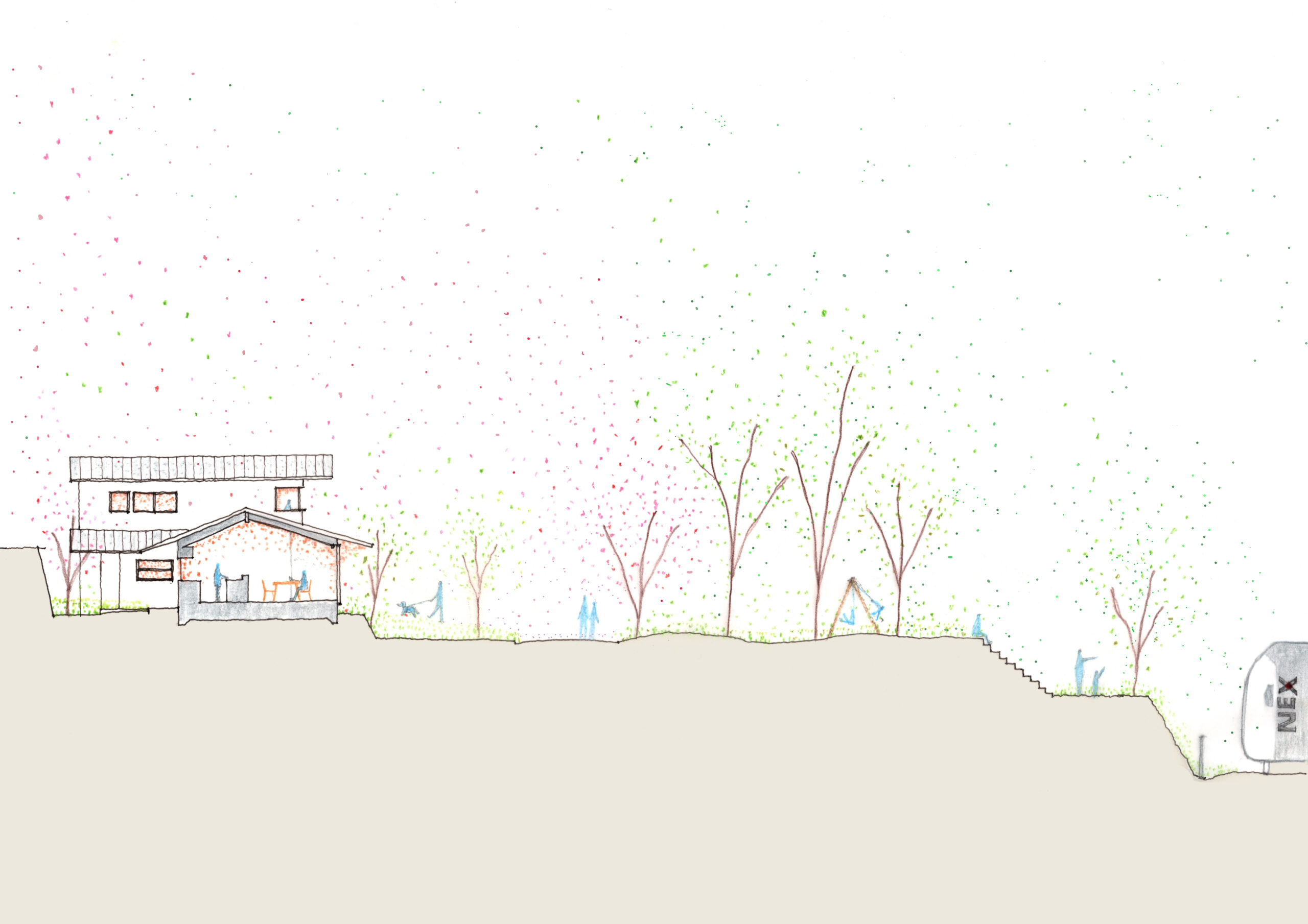 前面道路から石積み擁壁で1mほど高くなっていた「緑地公園の家」の敷地。道路側の擁壁は一部を残して撤去し、向かいにある緑地公園と連続するような前庭をつくると同時に、緑地公園と距離をとるようにしています。