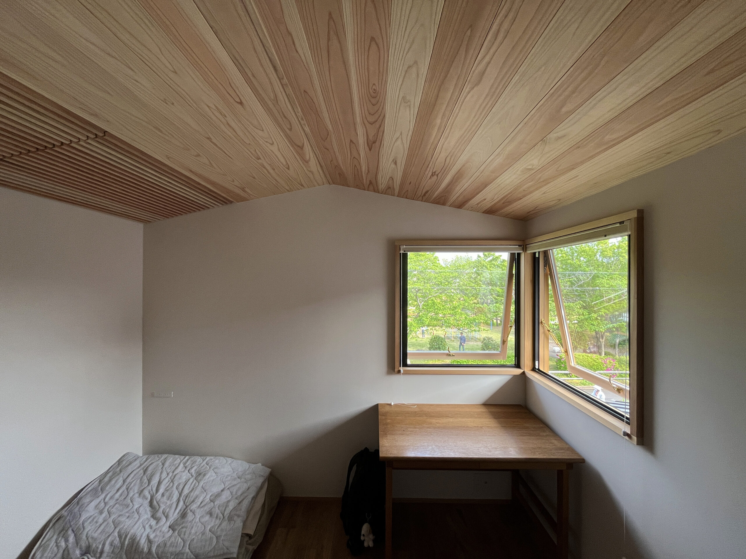 屋根はガルバリウム鋼板のキャップレス立はぜ葺き、軒天井は小節の杉板張り。高性能グラスウールの2重断熱によりしっかり断熱すると同時に、通気層を兼ねる垂木を伸ばすことで、深くシャープな軒をつくった。また、縦はぜの先端をテーパーにすることで、さらに軒先をすっきり見せている