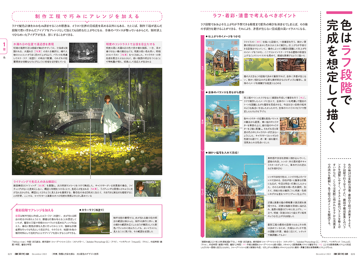 「その場の空気感まで伝える建築の配色」「時間帯による光と色の変化」など、さまざまな場面に役立つ色彩表現を大特集しています。