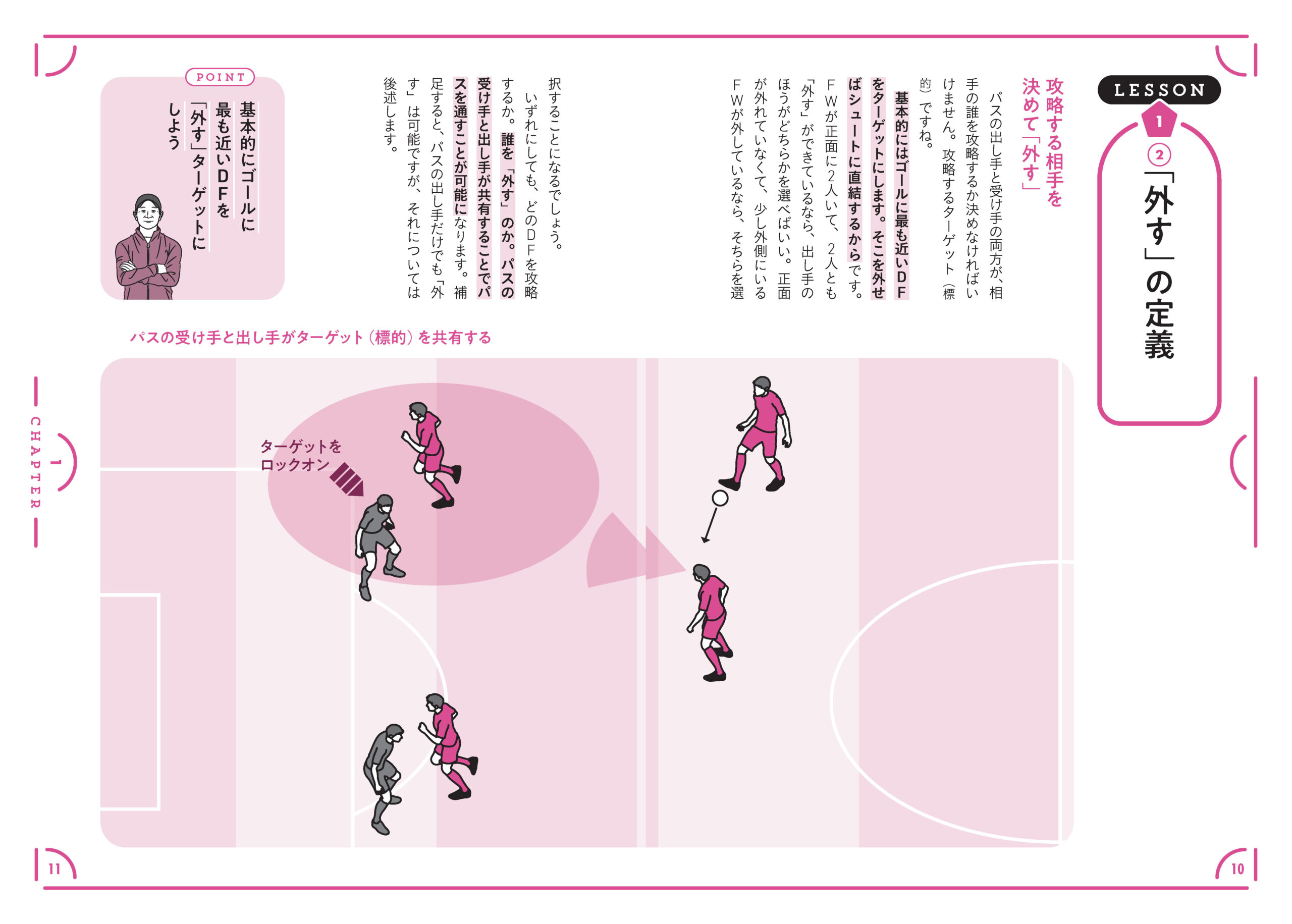 相手が守りたい場所、つまりゴール前=ペナルティエリアの中に入って勝負できるかがカギになります。相手が多くいたり、狭くてプレッシャーの厳しい場所でプレーするには風間さんの言う「外す」動きができるかどうかが重要です。「外す」とはひとことで言うと相手の矢印(重心移動の動き)の逆をとる動きのことです。これができればたとえ相手が近くにいても、マークを外してパスを受けたり、シュートまで行けたりします。これができないと世界トップレベルでは活躍するのが難しくなっています。