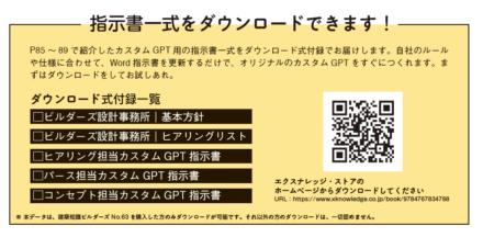 2章では、自社の書式・判断基準・業務ルールをAIに覚えさせ、社内アシスタントとして機能させる“育成方法”を解説する。ヒアリング、コンセプト作成、パース指示など、建築実務に特化したカスタムGPTを一瞬で構築できる指示書(ダウンロード付録)もあります!
