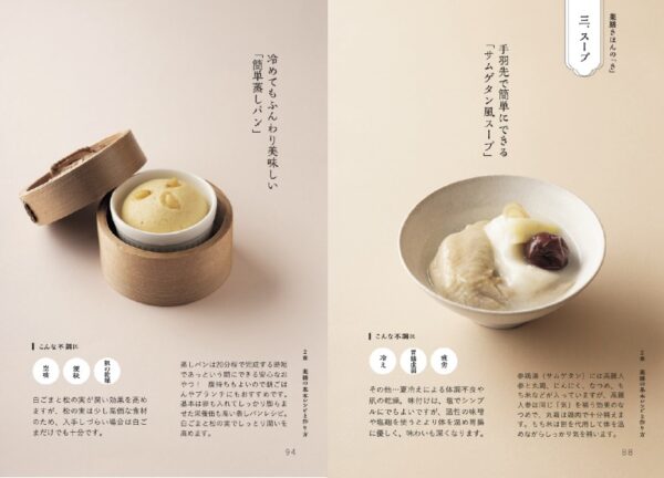 1章では、おもな薬膳食材とその使い方を紹介していますが、せっかく食材を買っても余らせてしまいそう、という人もいるかもしれません。また、忙しいから、週末の時間がある時に…と思っているうちにズルズルと使うのを忘れてしまうこともあるのではないでしょうか。今回、食材紹介では、効能の説明とともにすぐに使って作れる簡単レシピも掲載。まず、実践!ができる本です。