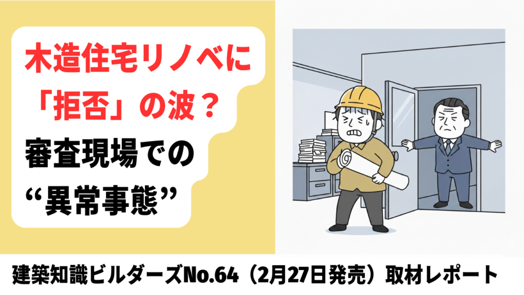 そう語るのは、大阪の高断熱住宅を得意とする工務店だ。新築の確認申請であればルーチンとして機能する審査機関の窓口が、既存住宅のリノベーションとなった途端、硬直するケースが続出している。既存部分の法適合性の判断や、解体後の整合性をどう担保するのか――。リスクを恐れる審査機関が、知見がないことを理由に「受理を敬遠する」という事態が起きているのだ。