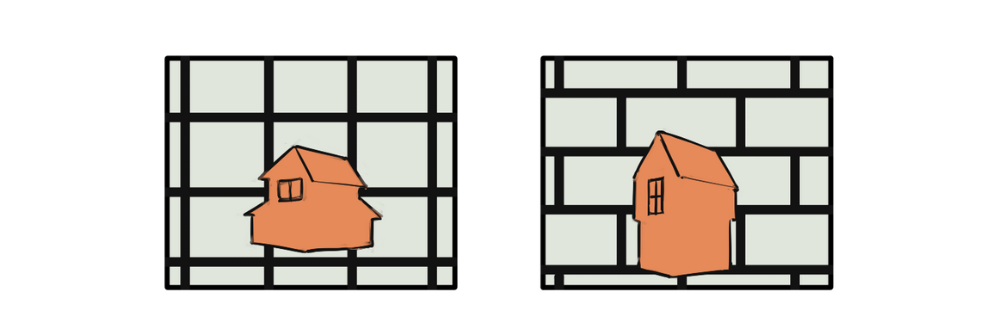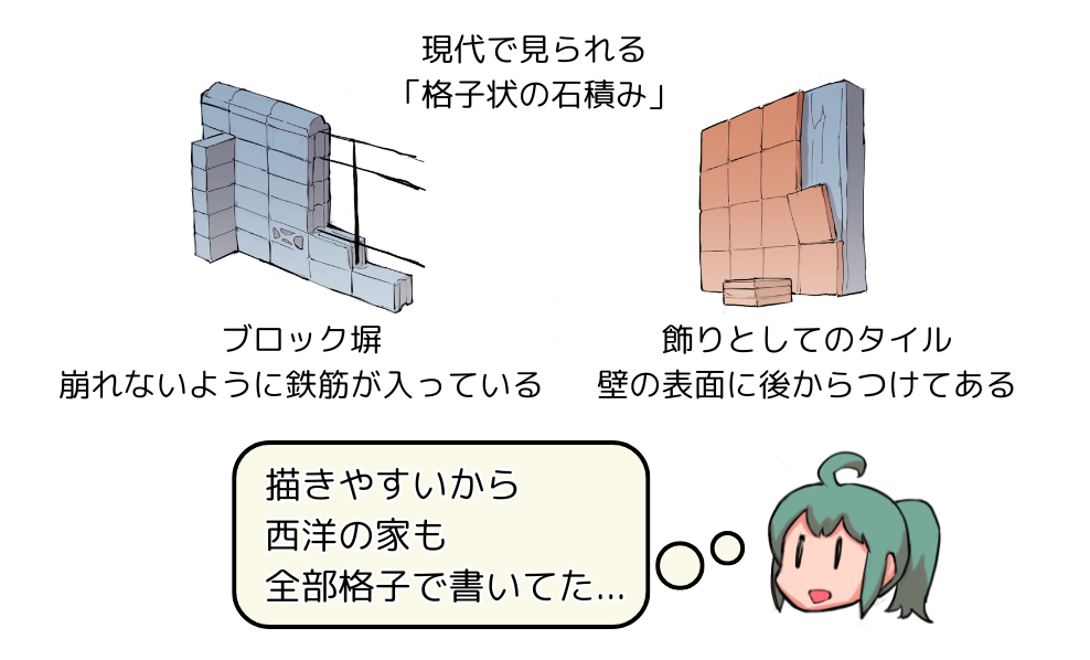 一方で、私たちは普段「石(コンクリート)が格子模様に積まれた形」をよく目にします。