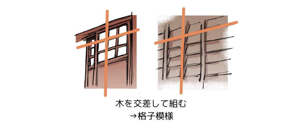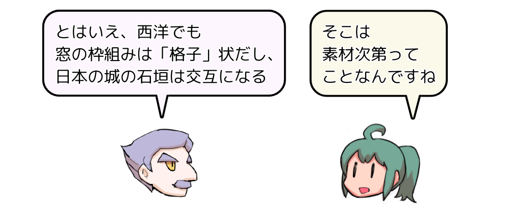 そのため、木の建築が多い日本では格子模様が、石の建築が多い西洋ではアミダ模様が「っぽい」特徴的な形になるわけです。