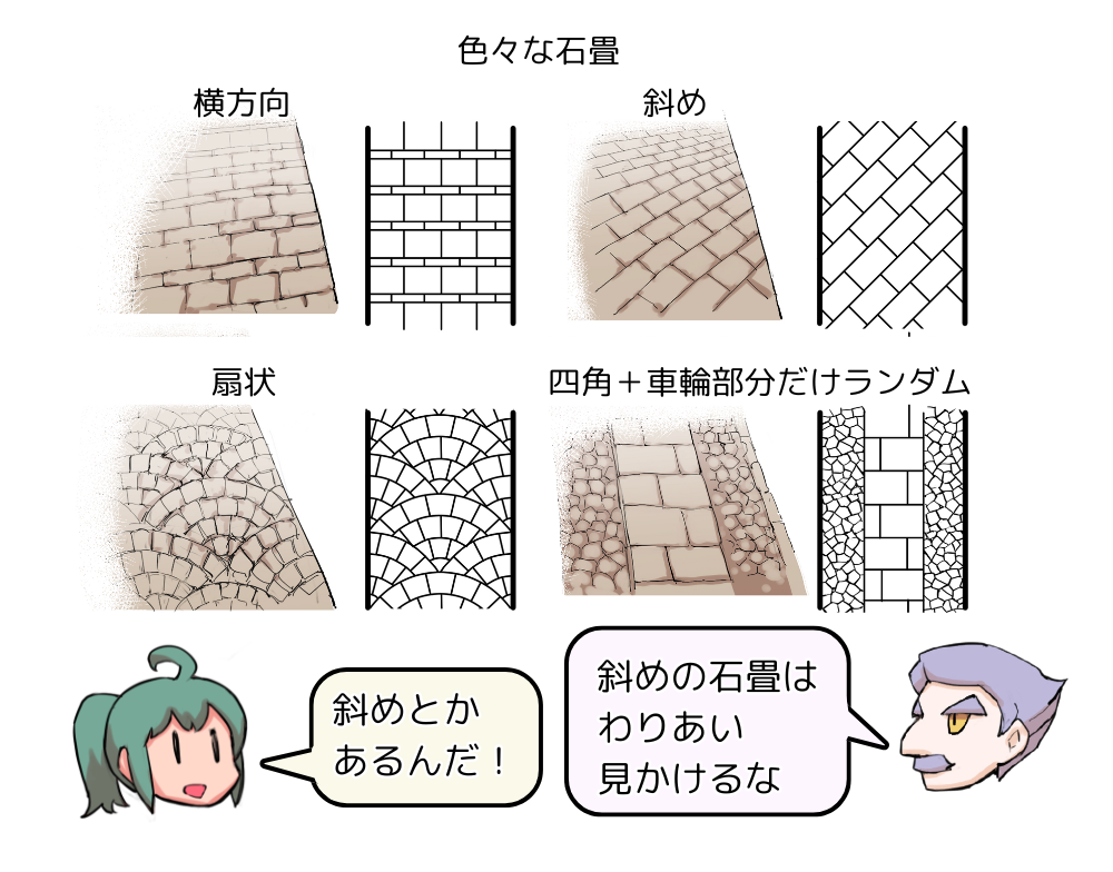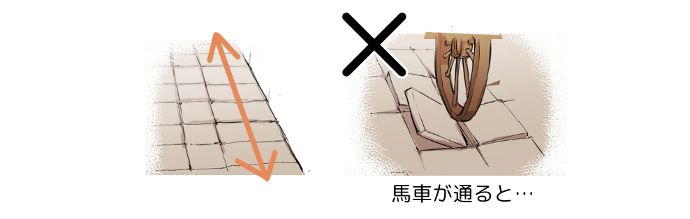 これはおそらく、進行方向に石どうしの溝が格子状に並ぶと、車輪が食い込みやすくなるからと考えられます。