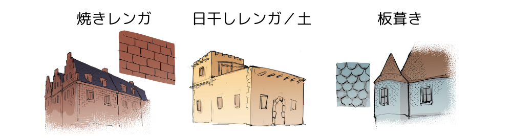 土色の「日干しレンガ」は、焼きレンガに比べて作るコストが低く、雨が少ない乾燥地帯でよく使われます。