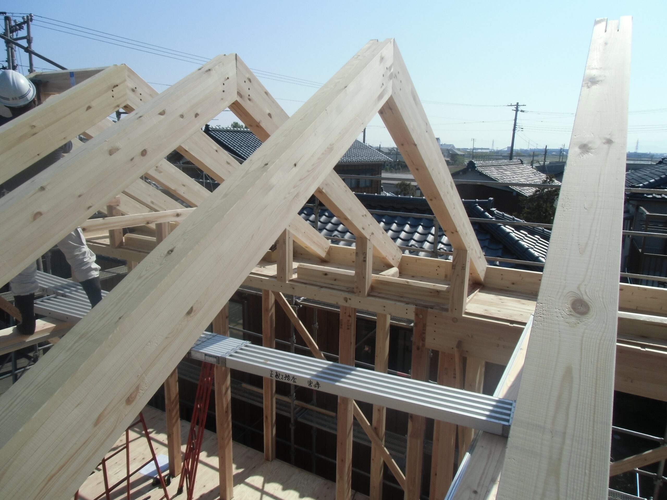一般的な和小屋形式では火打金物で屋根を固めますが、登り梁に厚物合板を直接打ち付ける形式にすると、屋根の「水平構面」の強度が格段に向上します。