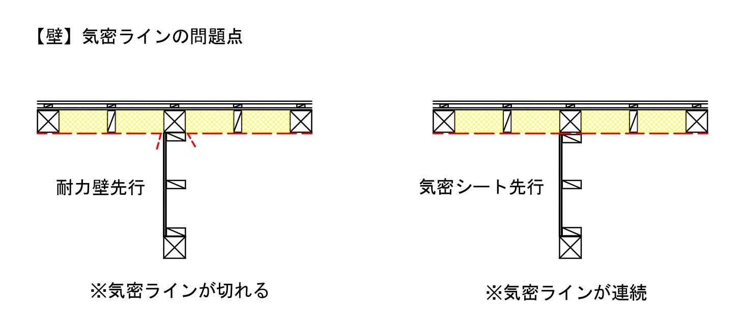 多くの現場で気密漏れの原因となるのは、天井と壁が交差する複雑な部位での気密フィルムの途切れです。最上階の柱や耐力壁を減らすことで、気密フィルムを途切れさせることなく連続して施工できる「天井勝ち」の納まりが容易になります。