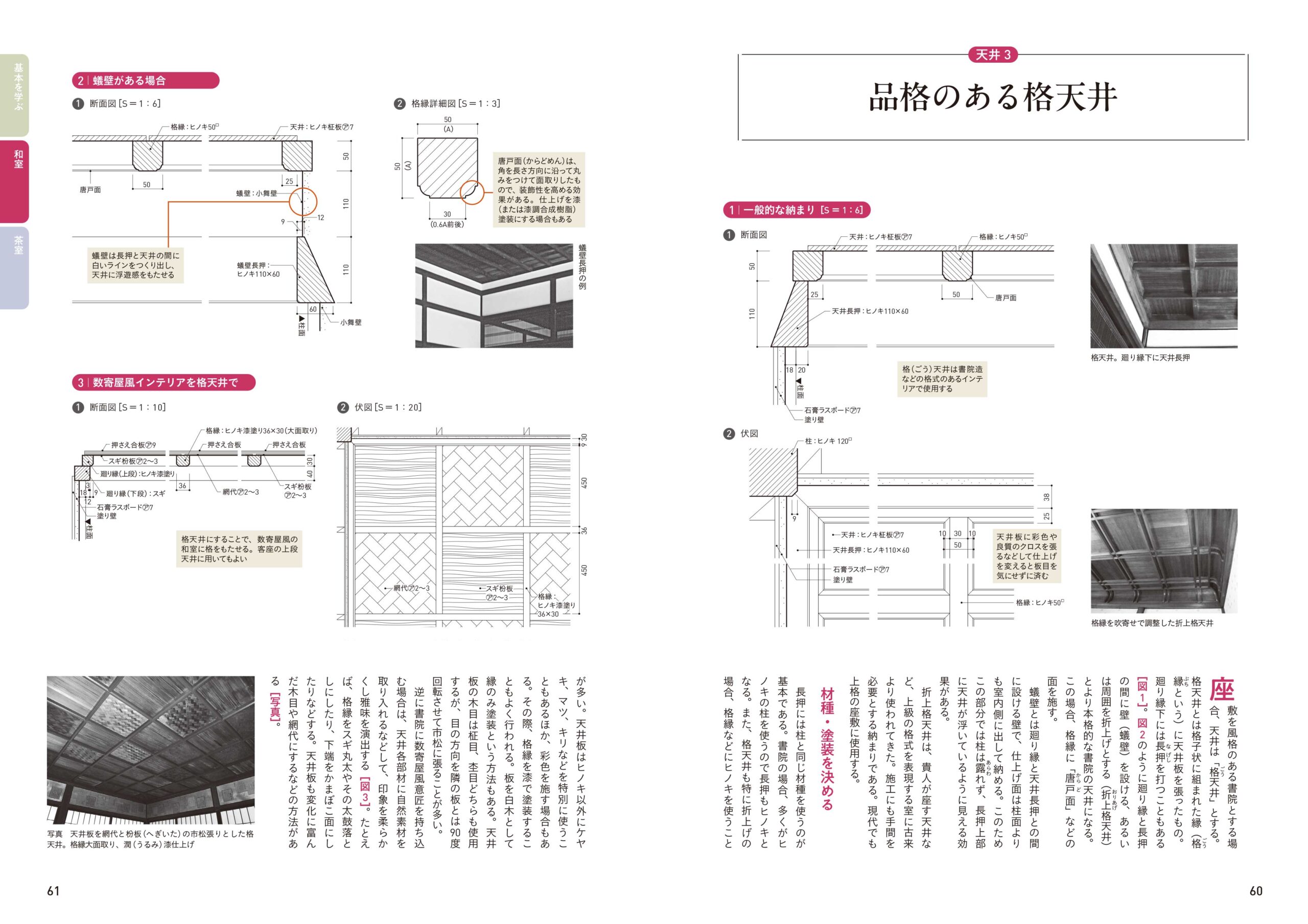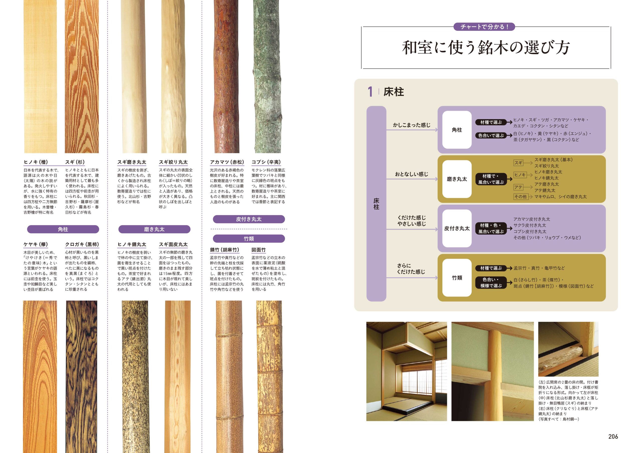 コラムではこれら木材の代表的な樹種の特徴と使い分けが分かる「木材テクスチュア図鑑」や、ディテールにこだわりたい時の木材の選び方がわかる「和室に使う銘木の選び方」を収録しています。