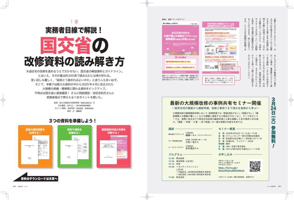 『建築知識ビルダーズNo.64』の特集は、「木造の大規模リフォーム 確認申請ガイド」。