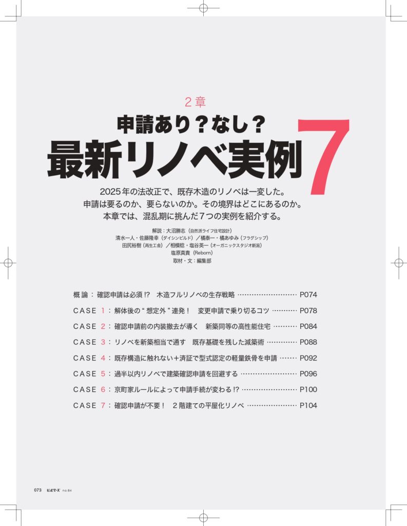 7つの実例解説では、法改正後の確認申請の要否を軸に、解体後の想定外の状況を突破した変更申請のプロセスから、規模調整や平屋化による申請回避のテクニックまで、工務店が直面する設計・施工実務のリアルをレポートしています。