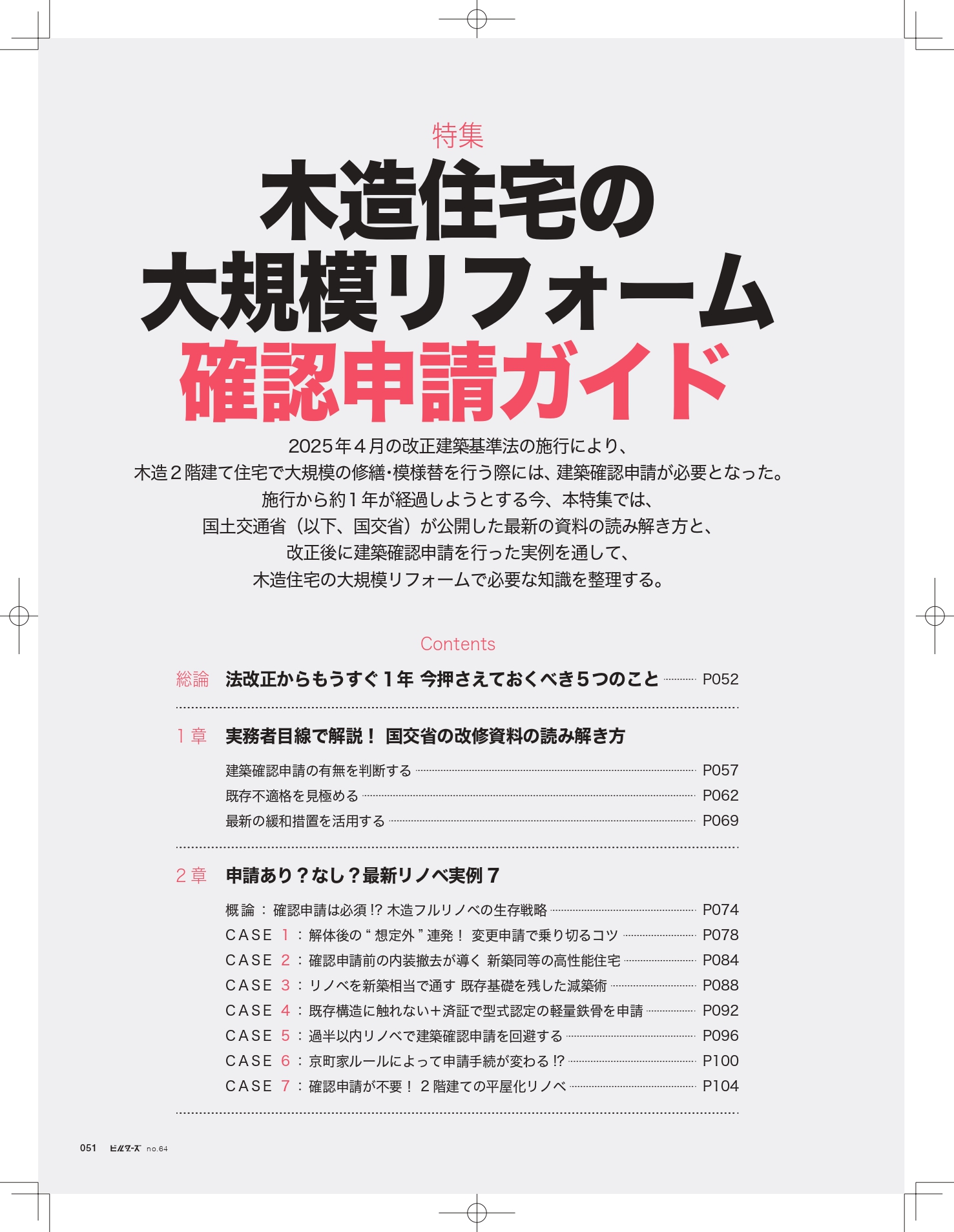 『建築知識ビルダーズNo.64』の特集は、「木造の大規模リフォーム 確認申請ガイド」。