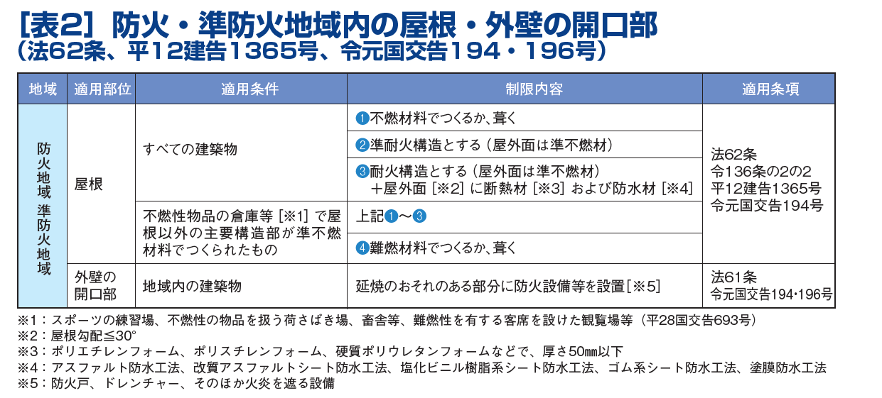一方、法第22条区域内の延焼のおそれのある部分では、木造建築物等の外壁を準防火構造とする必要があります(法第23条)。さらに大規模木造建築物等で合計延べ面積が1,000㎡を超える場合は、外壁および軒裏を防火構造としなければなりません(法第25条)。