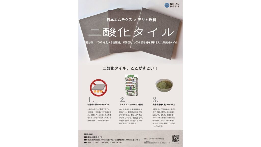 空気中のCO₂を吸着した原料を主成分に、焼かずに製造する環境配慮型「二酸化タイル」。製造時のCO₂ 排出を約90%削減、素材の9割超がアップサイクル原料。お茶殻・コーヒー粕など天然素材で着色した3色展開。300×300mm、床用12.5mm。