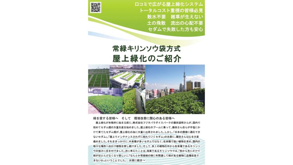 x LINEで送る Facebook コピー 2025/10/15 【カタログ情報】各種設備:常緑キリンソウ袋方式 日昇緑化研究所 常緑キリンソウ袋方式(日昇緑化研究所)に関するページです。 常緑キリンソウ袋方式は、緑豊かでローメンテナンスな屋上緑化システム。お客様にとっては、緑豊かで、除草・屋上清掃・水道代・潅水装置の維持管理・大規模修繕の撤去費用などが他のシステム比べると圧倒的に安く、トータルコスト重視のお客様のリピート採用が増えています。施工者にとっては、屋上への通水を心配せず施工工程を組むことができます。 日昇緑化研究所のHPはこちら 関係者があっと驚く12年経過の様子はこちら